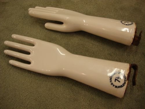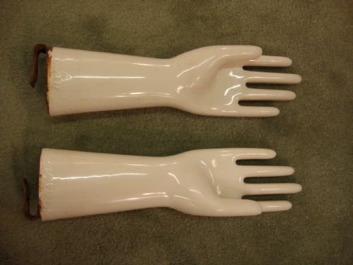 Wonderful vintage 1930's pair of smooth glazed ceramic or porcelain white glove moulds or forms. Made in England by the A.G. Hackney company, they were used to make longer length latex or rubber gloves, by dipping them into the mixture and waiting for the glove to cool.