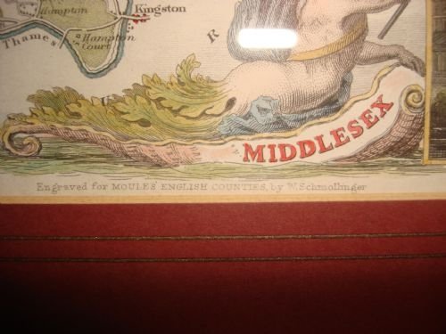 Lovely old beautifully coloured engraved map of Middlesex engraved for “Moules English Counties,” by W. Schmollinger, circa 1830, as per certificate to reverse of frame.
