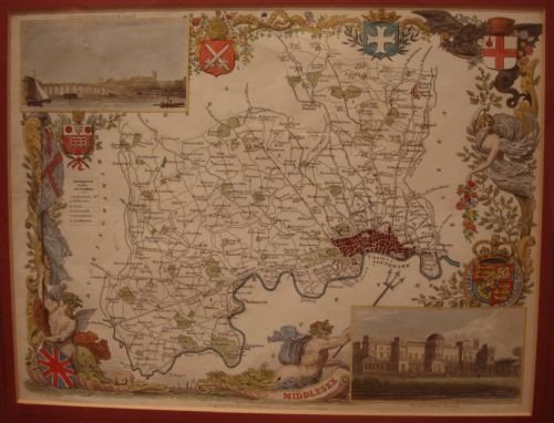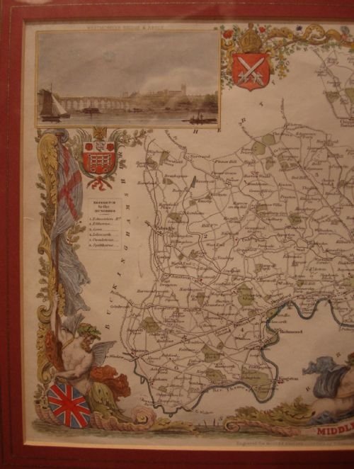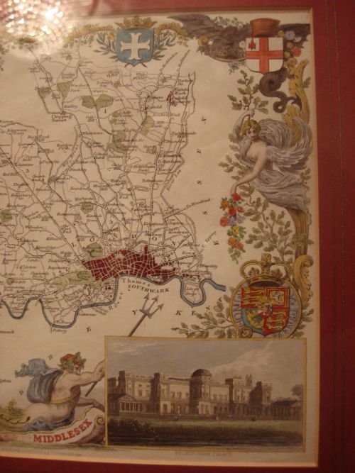 C1830, beautifully illustrated framed and glazed map of Middlesex, engraved for “Moules English Counties.”