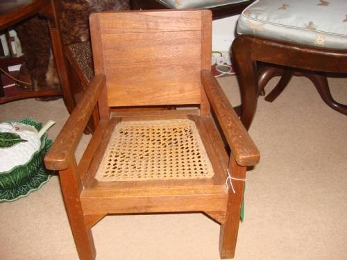 Early 20th century country made solid oak child's arm chair with removable cane seat insert.