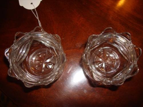 19th century Georgian pair of cut glass salts with draped swag design, star cut bases, and scalloped edges, standing on pedestal feet.