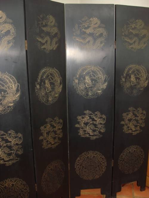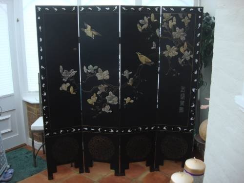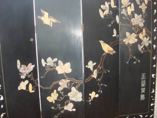 20th century four panel hinged two sided screen with semi precious hardstone carvings.