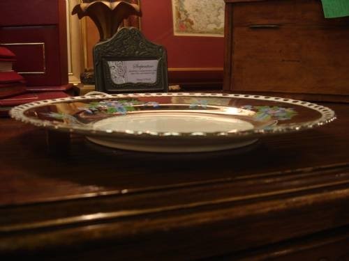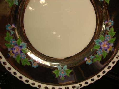 1912-1920 Mintons famous maker stunning dinner sized plate with wide platinum band having beautiful enamelled flowers and leaf embellishment.