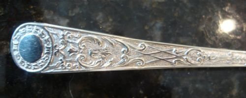 With curved and intricately decorated stem with vacant cartouche, this is an unusual and very versatile spoon for sauces, preserves, relish, olives and other condiments.