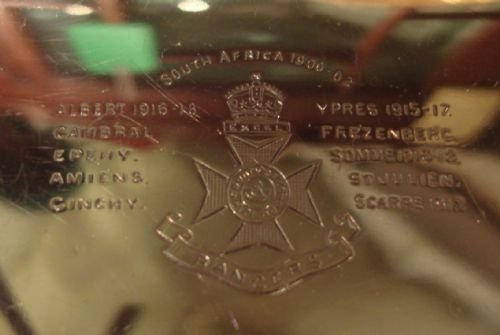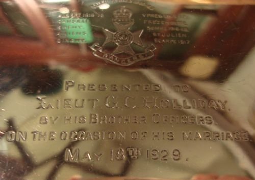 This box was given in 1929 to Lieutenant G. C. Holliday upon the occasion of his marriage, by his fellow officers in the 12th County of London Battalion, The Rangers. The lid bears the colours and major campaigns of The Rangers, and the personal inscription.