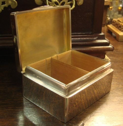 London 1920 English hallmarked solid silver box with cedar lining and movable divider, made in a heavy gauge of silver and having slightly domed top and rounded corners. Made by Joseph Braham.