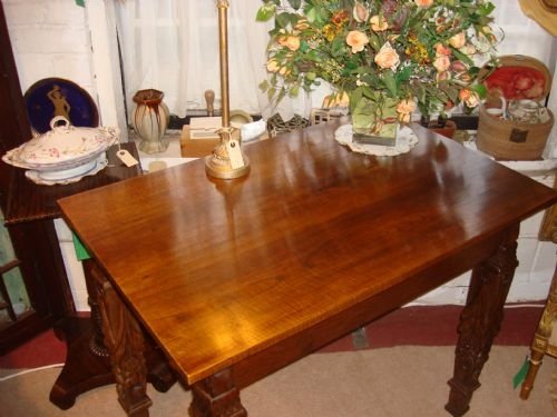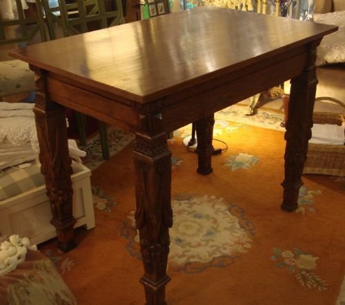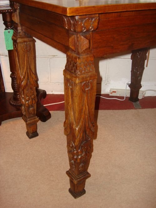 An interesting size for a serving, dining, computer or library table, or even for use as a kitchen island or baking centre, this unusual table is very versatile. The plain planked top is supported by a panelled frieze, and the whole stands on square tapering legs, carved on all sides with an elaborate design of rings, swags and tassels.
