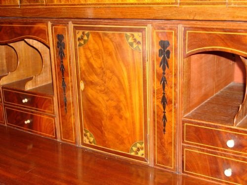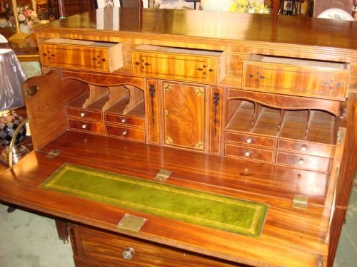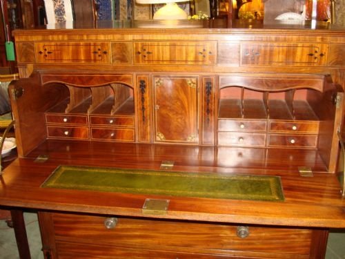 The fall front drops to reveal a green tooled gilt embossed leather surface and 8 small ivory handled line inlaid drawers and 8 pigeon holes with shaped dividers and with double width line inlaid serpentine fronted drawers over. These surround a central beautifully line and fan inlaid locking cupboard (with key) having vertical ebony swag inlaid secret drawers to either side. There are also 3 secret inlaid drawers in the frieze, that spring open when released from underneath.