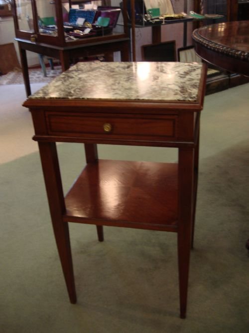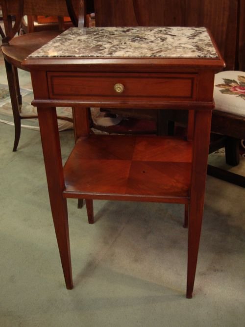 Very pretty 1940's French occasional table with a single drawer, inset square marble top over satinwood bases, united by a platform undertier, and standing on square tapering legs.
