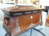 Stunning example of a William IV period tea caddy box or chest of imposing size, made in rosewood with exquisite mother of pearl inlay.